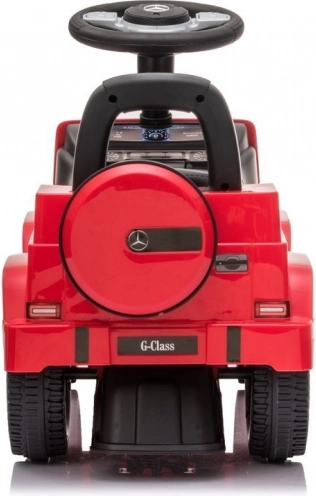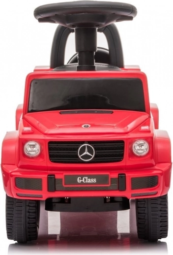 Rdeč otroški poganjalec MERCEDES G‑Class z zvoki hupe in motorja, usnjenim sedežem in prostorom za shranjevanje. Nosilnost 25 kg, za otroke 1–3 leta.