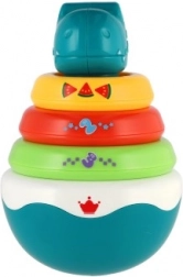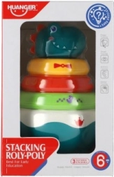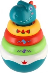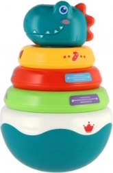 Ta igriva zlagalna piramida z motivom dinozavra združuje zabavo in učenje. Zaobljen podstavek se ob rahlem dotiku ziba v vse smeri in sproži prijeten zvok zvončka, ki naravno spodbuja sluh. Otroci vadijo prijem, razvrščanje obročkov po velikosti in prepoznavanje barv – idealno za prvo odkrivanje sveta.