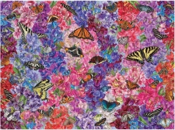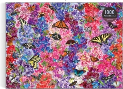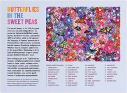 Podrobne ilustracije metuljev v cvetlični krajini z bogato paleto rožnatih, sivkastolilastih in modrih tonov razveselijo oko in vabijo k sestavljanju.