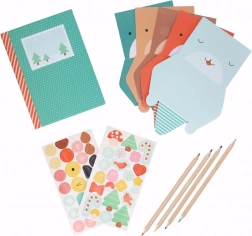 Set vsebuje 12 živalskih pisemc, dnevnik, 2 pola nalepk in 4 barvne svinčnike – pripravljeno za ustvarjanje takoj po odprtju.