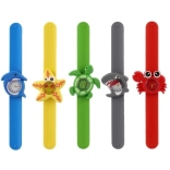 Zabavna otroška ura z motivi morskih živalic omogoča lahko učenje časa in udobno nošenje. Zahvaljujoč samonavijalnemu (slap) silikonskemu paščku se ura enostavno namesti z enim »mah« gibom. Barvno razlikovane kazalke pomagajo otrokom lažje brati čas, vgrajena baterija LR626 pa omogoča takojšnjo uporabo. Na voljo je 5 veselih motivov – delfin, morska zvezda, želva, morski pes in rak.