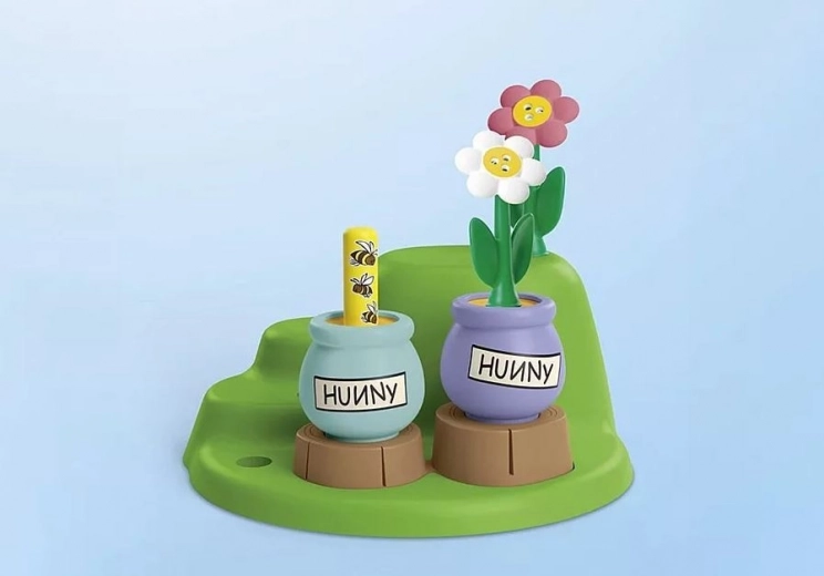 Ta igrivi komplet iz sveta Disney Junior otroke popelje v čebelji vrtiček, kjer lahko krasijo trato s cvetlicami, vstavljajo čebelje paličice v medene lončke ter z enostavnim pritiskom aktivirajo skakalni mehanizem. Ko jih spustijo, čebelice zabavno poskočijo – idealno za raziskovanje vzroka in posledice.