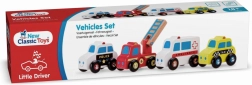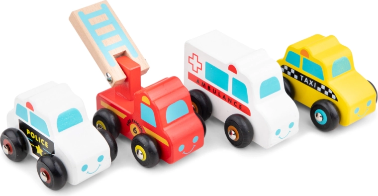 Ta komplet vsebuje štiri barvita in vzdržljiva lesena vozila: policijski avtomobil, gasilni avto, rešilni avtomobil in taksi. Igra s temi vozili spodbuja razvoj grobe motorike in domišljije. Vsako vozilo je zasnovano tako, da je varno in zabavno za najmlajše otroke.