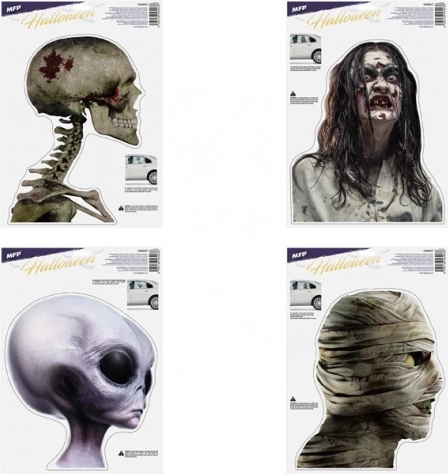 Nalepke so idealne za okna, vitrine, ogledala in ploščice ter jih zaradi možnosti ponovne uporabe izkoristite iz leta v leto. Motive dobavljamo glede na trenutno zalogo (konkretnega motiva ni mogoče izbrati); pričakujete lahko strašljive lobanje, mumije, zombije ali druge halloween motive.
