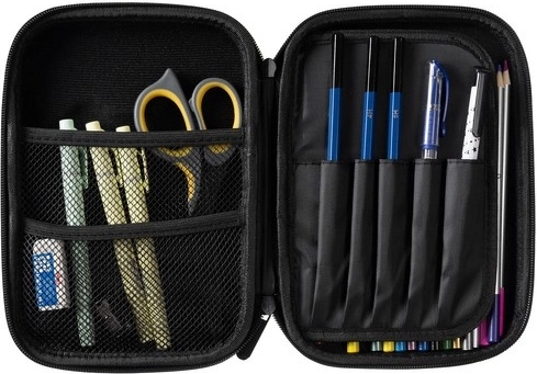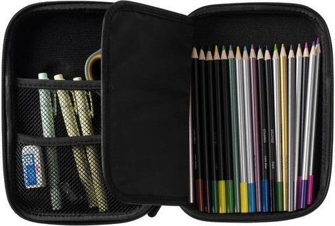 V notranjosti boste našli notranje krilce s 6 zankami za svinčnike, kemične svinčnike ali flomastre, 2 mrežasta žepa za drobnarije in glavni predel, ki sprejme komplet likovnih pripomočkov ali tablico do 8,5″. Krilce hkrati ščiti zaslon pred praskami. Peresnik odlično služi v šoli, na poti ali kot praktičen organizator v domači pisarni.