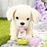 Pri pitju iz skledice kužek skloni glavico, pomoli jezik in sliši se srkanje. Po pitju dvigne tačko in se pocuka – realistična funkcija, ki otroke navduši in spodbuja domišljijo pri igri skrbi za žival. Košček kosti sproži zvoke grizljanja, božanje po hrbtu pa mahanje z repkom in veselo lajež.