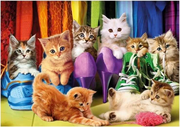 Slika, polna čevljev, klobčičev in igrivih muck, bo navdušila vse ljubitelje živali. Zahvaljujoč trdnemu, zdravstveno neškodljivemu kartonu in natančnemu izseku posamezni kosi lepo zagrabijo drug v drugega in držijo obliko.