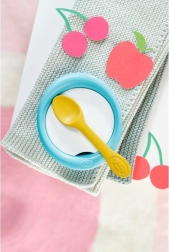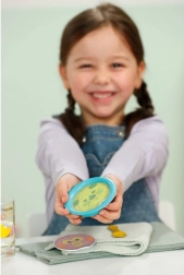 Komplet vsebuje skodelico, žličko in 5 ploščic z različnimi vrstami jedi, ki spodbujajo igranje vlog, fino motoriko in domišljijo. Vse je lahko, varno in enostavno za čiščenje, zato je idealno za vsakodnevno igro.
