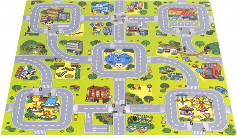 Sestavljena podloga ponuja prostorno mestece s cestami in parki. Idealno za vožnjo avtomobilčkov, gradnjo prizorov in učenje cestnoprometnih pravil skozi igro.