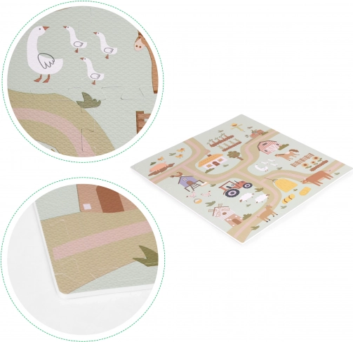 Certificirana EVA pena je varna za otroke, ima protizdrsno teksturo in dobro blaži morebitne padce. Ilustrirani elementi kmetije (traktorji, živalice, poti) vabijo k raziskovanju in podpirajo učenje skozi igro.