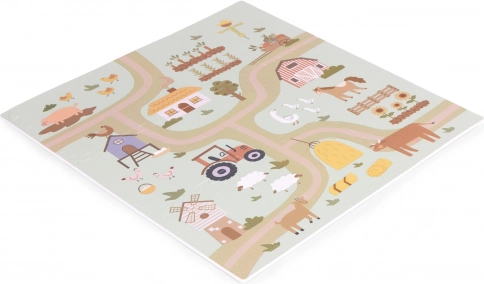 Odkrijte univerzalno penasto podlogo s kmečkim motivom, ki podpira kreativno igro in razvoj domišljije. Zahvaljujoč prijetni površini in debelini 1 cm ponuja otrokom udobje pri igri, plazenju in počitku. Podloga se sestavlja kot sestavljanka, zato jo zlahka prilagodite prostoru in ustvarite različne oblike.