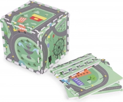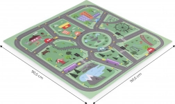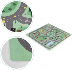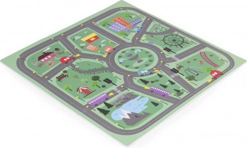 Podroben motiv cest, križišč in mestnih elementov otroke navdihuje k izmišljanju zgodb, vožnji z avtomobilčki ter razvoju domišljije in fine motorike.