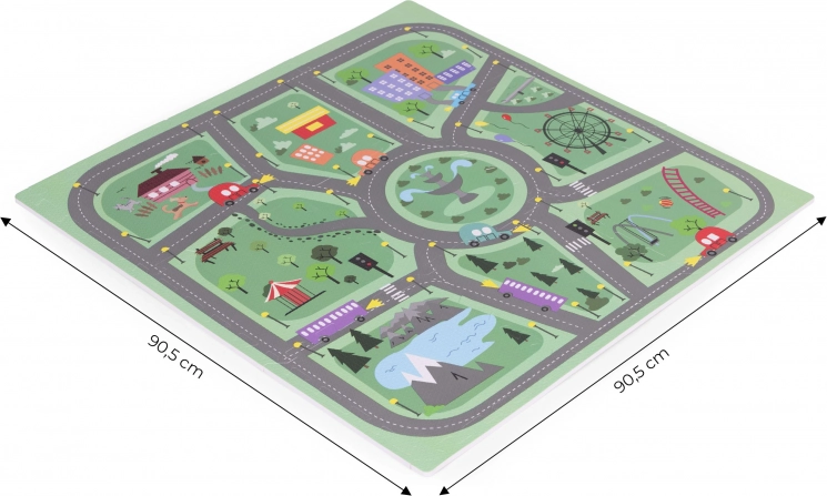 Ta kakovostna penasta podloga s podrobnim motivom mesta otrokom ponuja neskončne možnosti igre: ceste, ulice in križišča vabijo k vožnji z avtomobilčki in izmišljanju lastnih zgodb. Zaradi debeline 1 cm je površina prijetno mehka, blaži udarce in hkrati izolira od hladnih tal. Podloga je iz certificirane EVA pene, ki je lahka, trpežna in prijazna do otroške kože.