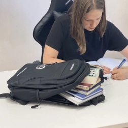 Praktična razporeditev vključuje glavni predal z dvema drsnikoma za udobno odpiranje, oblazinjeni predal za prenosnik / tablico, drugi predal za zvezke in ravne materiale, sprednji žep za malico in drobnarije ter stranska mrežasta žepa za steklenico. Odsevni trak povečuje vidnost v mraku. Nahrbtnik je vsestranski – za šolo, službo, trening in prosti čas.