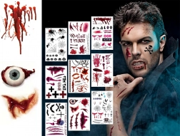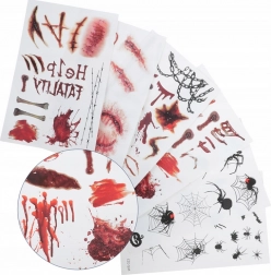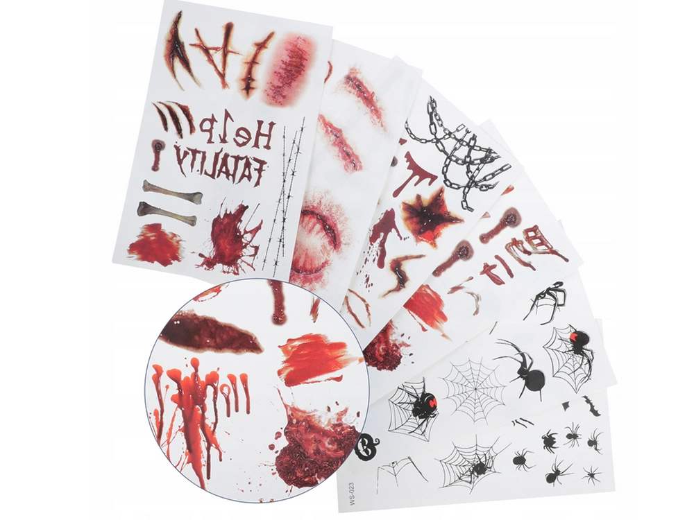 Vsak list ponuja različne vzorce – od krvavih pack do pajkov in brazgotin. Vzorci so dobavljeni v mešanem naboru, izbira ni možna.