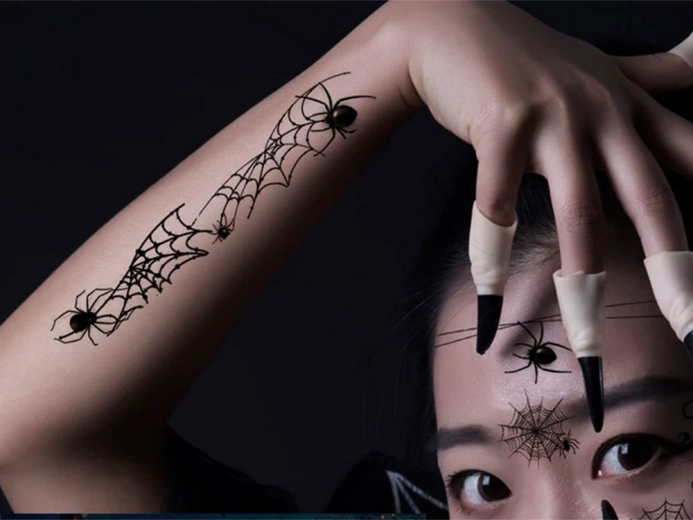 Tetovaže nanesete v nekaj sekundah: prislonite, navlažite, odstranite papir – končano. Učinek lahko dodatno poudarite z ličili: s temnimi senčili, črtami ali umetno krvjo ustvarite globino, senčenje in lesk svežih ran. Po dogodku tetovaže zlahka odstranite z vodo in milom ali odstranjevalcem ličil.