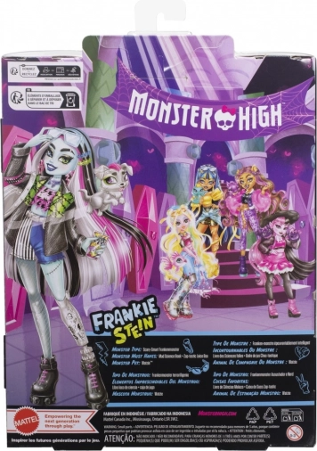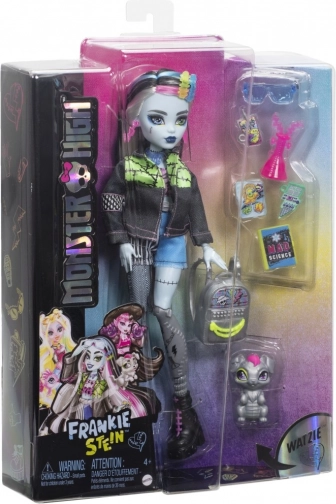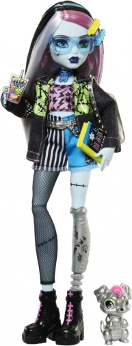 Spoznajte ikonično dijakinjo MONSTER HIGH – Frankie Stein. Ta lutka izstopa z impresivno mešanico punk in techno sloga: jeans jakna, kratke hlače, izraziti uhani v obliki strel in črni gležnjarji z rožnatim zavezovanjem. Zahvaljujoč zglobom za nastavljanje poz zlahka ustvarite kul prizore in zgodbe.