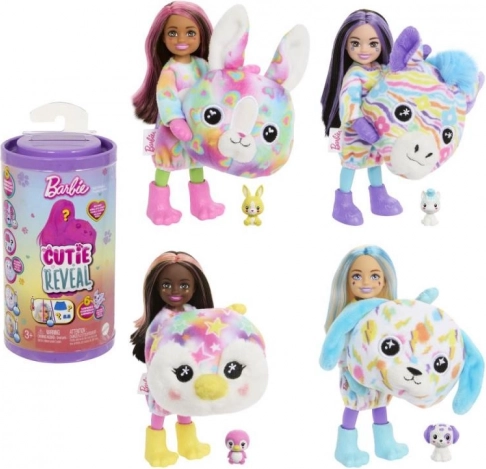 Lutke Barbie Cutie Reveal Chelsea Pisane sanje prinašajo otrokom veselje odkrivanja in domiselnega stiliranja. Ljubek plišasti kostum (zajček, zebra, pingvin ali dalmatinec) se po razkritju spremeni v oversize plašček za lutko, glava kostuma pa v ležišče za mini živalčka. Vsako odpiranje skriva do 6 presenečenj ter spodbuja domišljijo in fino motoriko.