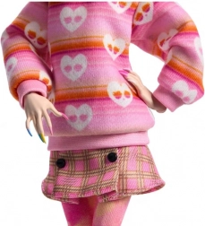Kolekcija Monster High x Wednesday opeva mračni humor in atmosfero, kot jo poznamo iz serije. Enid Sinclair se ne boji kombinirati vzorcev v svojem outfitu: črtast pulover, karirasto krilo in pisane nogavice se zlivajo v ikoničen videz.