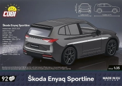 Komplet Škoda Enyaq Sportline je pomanjšan model v merilu 1:35, ki zvesto reproducira značilne oblike originalnega vozila Škoda Enyaq iV. Ima vrtljiva kolesa s pnevmatikami, ki so idealna za premikanje med igro. Ta model bo navdušil ne le otroke, temveč tudi odrasle ljubitelje kompletov, zbiratelje in avtomobilske navdušence.