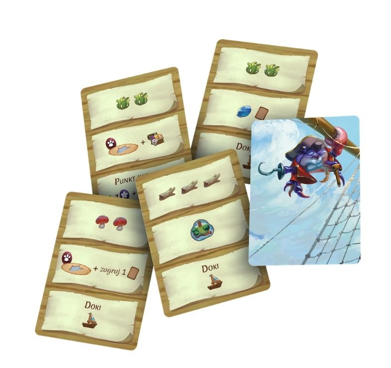 - 1 igralna plošča, pravila, 1 svetilnik, 24 lesenih delavcev, 155 kart, 24 ploščic zemljevidov, 10 ploščic otokov, 8 ploščic vetrovnic, 58+ žetonov zakladov, 10 označevalcev barv kart, 12 sider, 4 ladje, 60+ školjk, 30+ lesenih hlodov, 30+ šopov alg, 30+ kristalov, 30+ gob