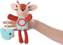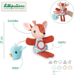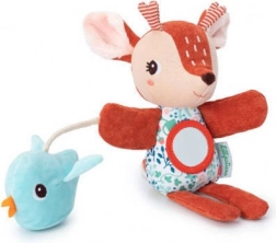 Ročna lutka je idealna za skupno branje, pripovedovanje in umirjanje pred spanjem. Vgrajena ogledalce, ropotulja/zvonček in šušteči ptiček naravno spodbujajo vid, sluh in tip. Odlična ideja za darilo za dojenčke od 6 mesecev.