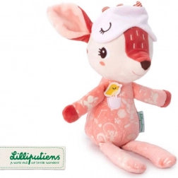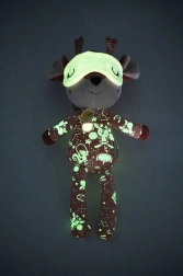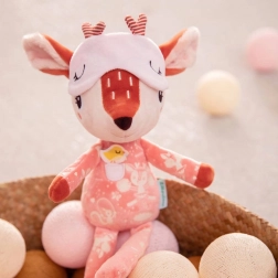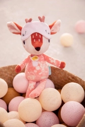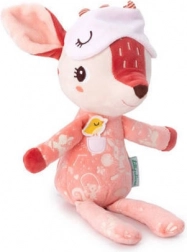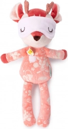 Srnica Stella v opečnato rožnati barvi nosi ljubko pižamo z žepkom in aplikacijo ptička, ki podpira tipno in vizualno zaznavanje. Spalno masko je mogoče potegniti čez oči, po ugasnitvi luči pa sveti v temi, kar pred spanjem vzbuja občutek varnosti in udobja. Igrača je kakovostno izdelana, mehka in prijazna do občutljive otroške kože.