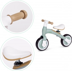 Nastavljiva višina sedeža (36–43 cm), mehak sedež in nedrseči ročaji nudijo udobje doma in na prostem. Brezzračna kolesa so tiha in oprijemljiva, odstranljiva pomožna koleščka in pedali pa povečajo samozavest pri prvih vožnjah.