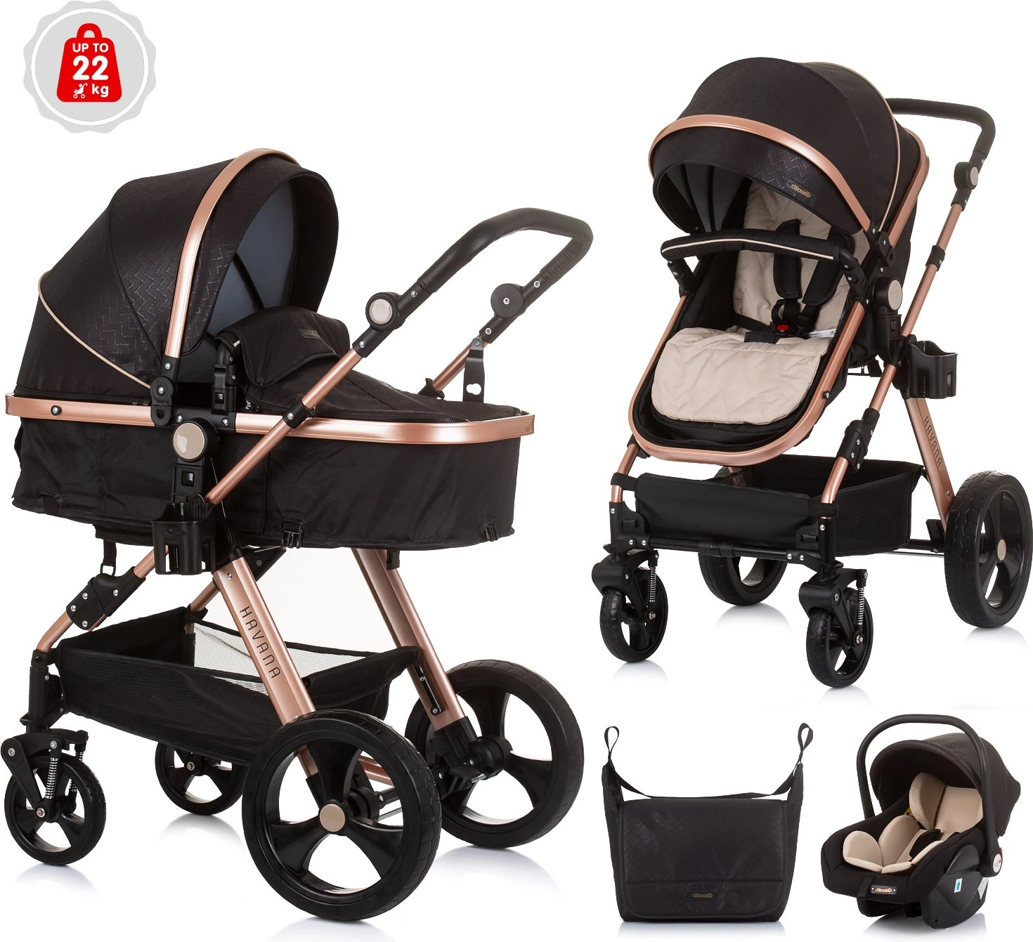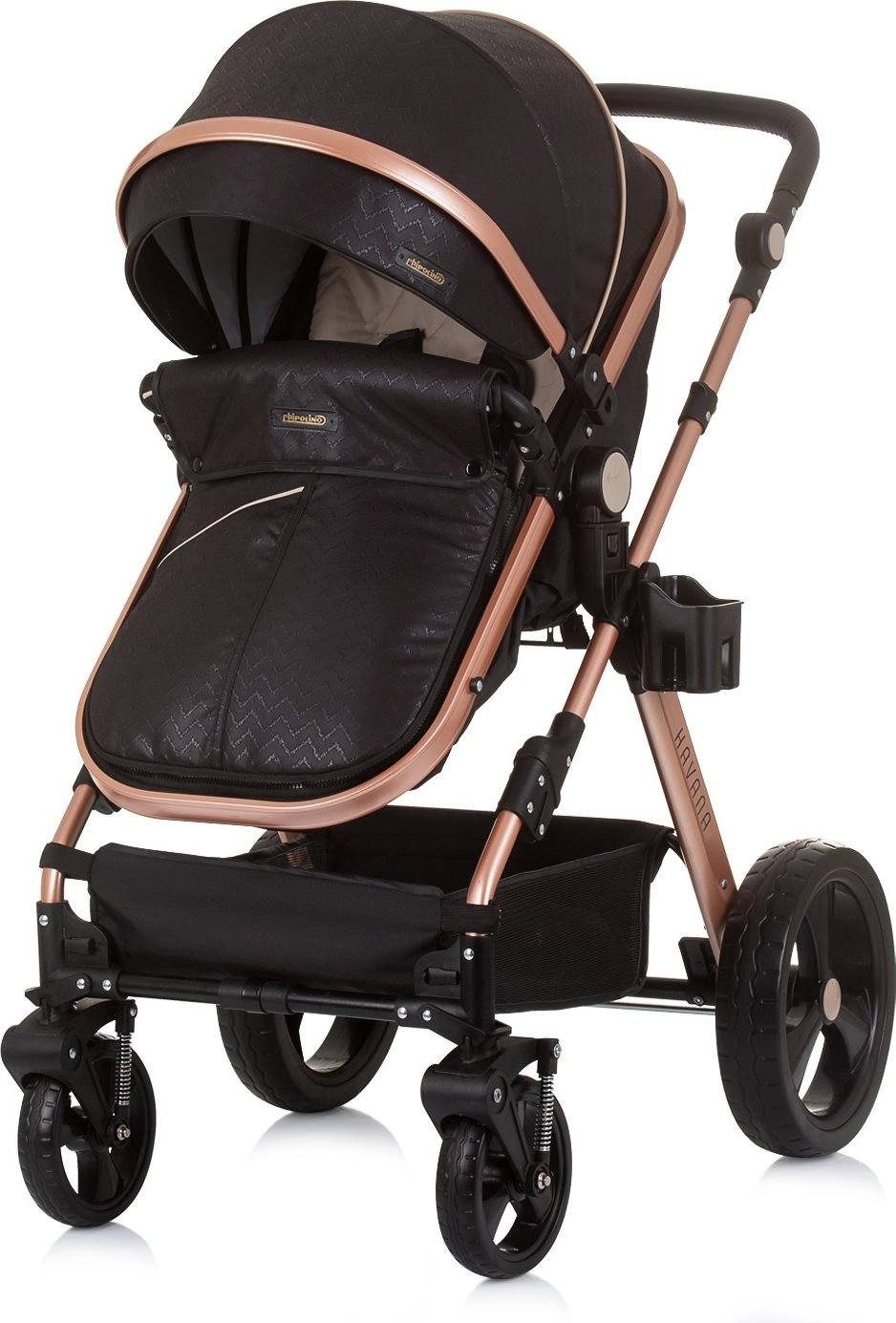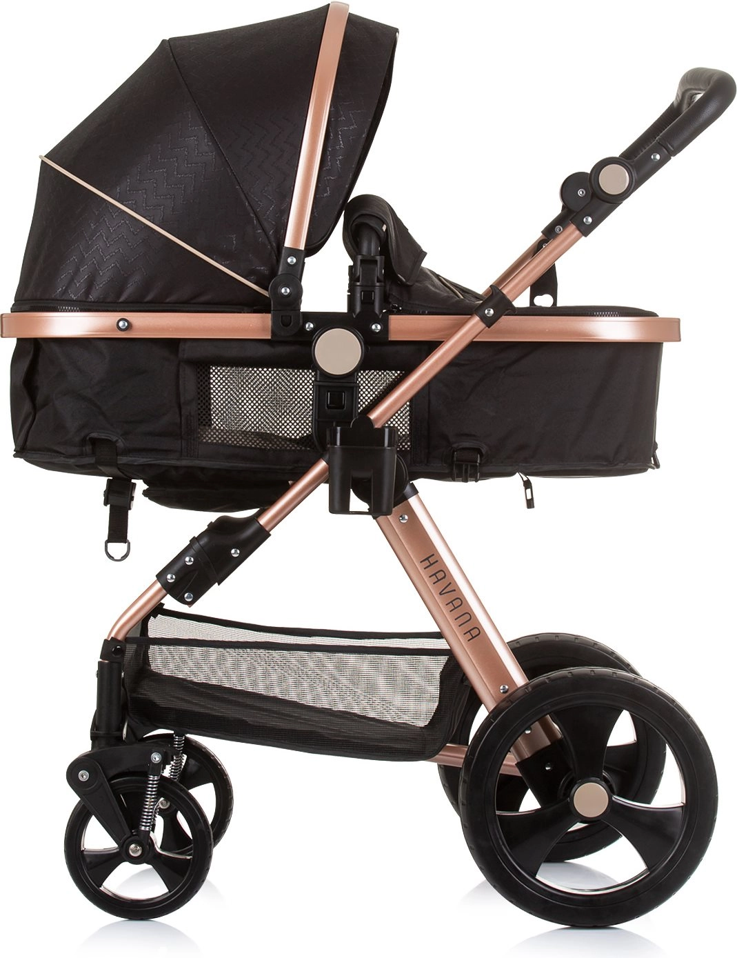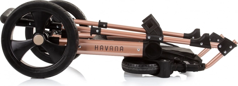 Voziček Havana 2v1 združuje globoko košaro in športni sedež v eni pametni enoti. Sedež zlahka spremenite v udobno košaro za dojenčka do 9 kg, kasneje pa uporabite športni nastavek do 22 kg. Lahko, a trpežno ogrodje iz zlitine ter učinkovito vzmetenje koles zagotavljata gladko in stabilno vožnjo v mestu in parku.
