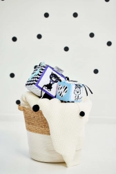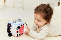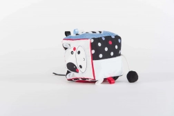 Ta mehka senzorična kocka je zasnovana za najmlajše raziskovalce. Vsaka od šestih strani prinaša drugačno senzorično izkušnjo – od kontrastnih črno-belih vzorcev z barvnimi poudarki do raznolikih tkanin in površin, ki vabijo k dotiku in odkrivanju. Prisrčni motivi krave in tigrа spodbujajo radovednost ter učijo otroka prepoznavati oblike in emocije.