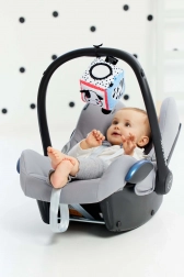Izstopajoči elementi, kot sta kravja ušesa in tigrov rep, olajšajo prijem in vadijo stisk. Praktičen žepek s plišasto žogico na vrvici spodbuja vstavljanje in izvzemanje, kar odlično krepi koordinacijo oko–roka. Vgrajeno varno otroško ogledalce pritegne pozornost in pomaga razvijati zaznavo lastnega odseva, medtem ko etikete/trakci na drugi strani spodbujajo tip in gibanje prstkov.