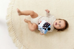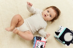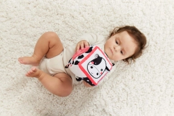 Visok kontrast črno-belih motivov z barvnimi detajli spodbuja vid in ohranja pozornost dojenčka med igro.