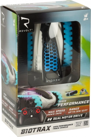 REVOLT BIOTRAX je futuristični gosenični RC model, ki izstopa po odlični prehodnosti in stabilnosti na najrazličnejših površinah. Robustno plastično ohišje in široke gumijaste gosenice zagotavljajo odličen oprijem, zato boste uživali v gladki vožnji po preprogi, tlakovcih in travi. LED učinki poudarijo agresiven dizajn v modro-belem videzu.