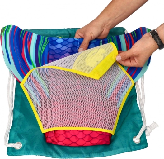 Praktična tekstilna vreča za plavanje z motivom morske deklice je idealna za bazen in plažo. Zahvaljujoč mrežastemu delu se hitro suši, je lahka, trpežna in jo je mogoče preprosto prenašati. Enostavno zategovanje z vrvico, zračen material in igriv dizajn KUAKI MERMAIDS jo naredijo odlično izbiro za otroke in najstnike.