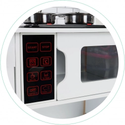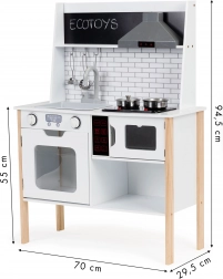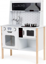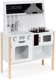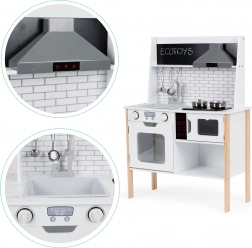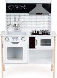 Stilska lesena kuhinjica za male kuharje od 3 let prinaša realistično zabavo zahvaljujoč LED osvetljenim kuhalnim ploščam, zvokom kuhanja in vrtljivim »klikalnim« gumbom. Ne manjkata odpirajoča se pečica in mikrovalovka, premična armatura ter shranjevalne omarice za red. Kakovostna stabilna konstrukcija znamke ECOTOYS razvija domišljijo in fino motoriko.