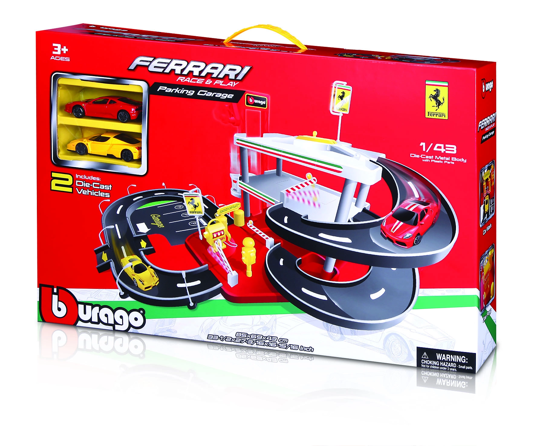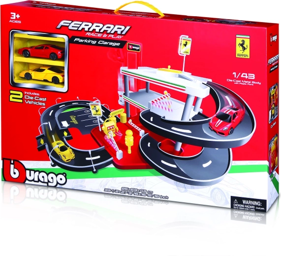 Tronadstropna garaža FERRARI Race & Play prinaša otrokom avtentičen svet dirk in mestnega prometa. Zapeljite avtomobilček z dvigalom vse do vrha, spustite ga po cesti, natočite gorivo pri črpalki, zapeljite skozi avtopralnico ter upravljajte dvižno zapornico in ploščad. Zahvaljujoč robustnim in barvitim plastičnim delom se set preprosto sestavi in je idealen za vsakodnevno igro.