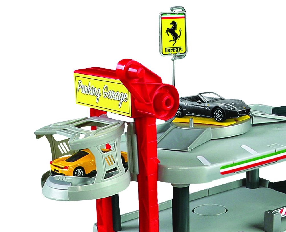 - Bogata oprema: večnivojsko parkiranje, označevanje, dodatki in 2 kovinska avtomobila FERRARI 1:43.
