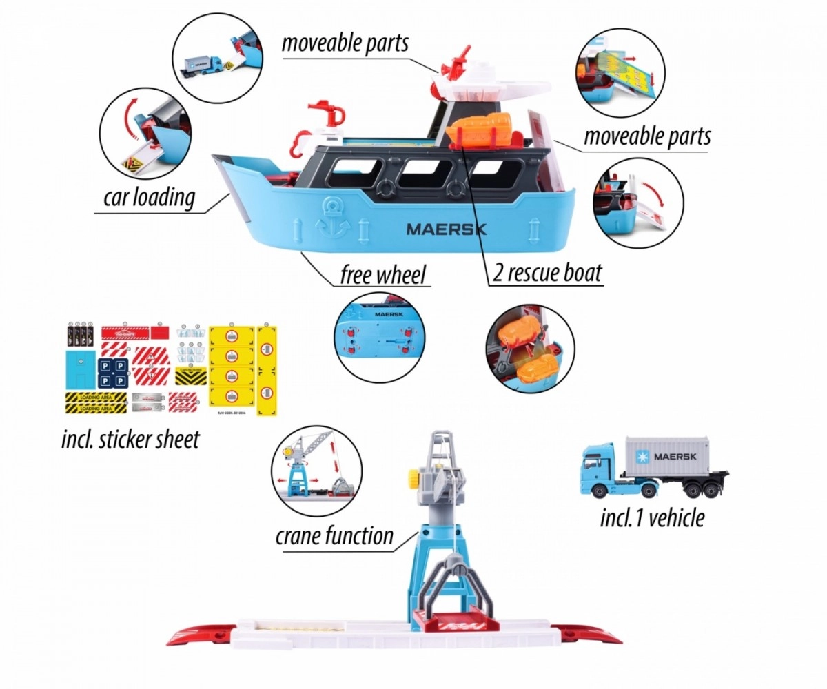 - Realistične funkcije in premični deli – tako kot na pravi tovorni ladji se kontejnerji in celo celotni avtomobili nalagajo na ladjo z ročno upravljanim žerjavom. Vozilo ima tudi zložljivo nakladalno rampo.