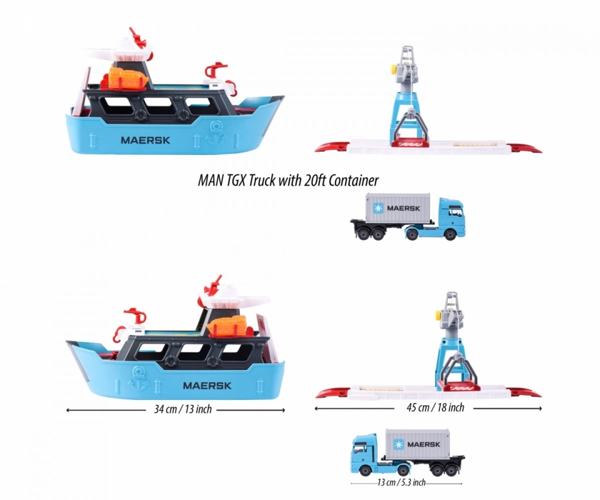 - Licencirano pristanišče za igrače Majorette Creatix s tovornjakom MAN TGX s kontejnerjem – logistična postaja Maersk v hipu spremeni otroško sobo v tovorno pristanišče in zaposli otroke z razkladanjem tovornjakov ter prevozom blaga z ladje.