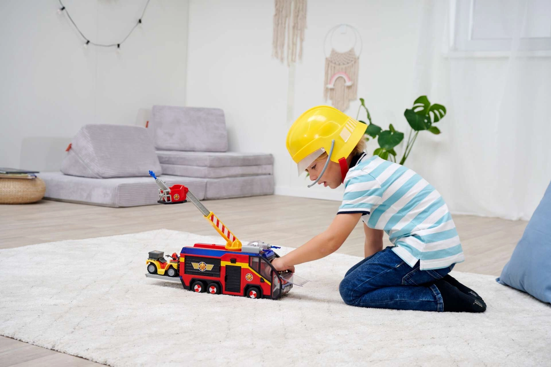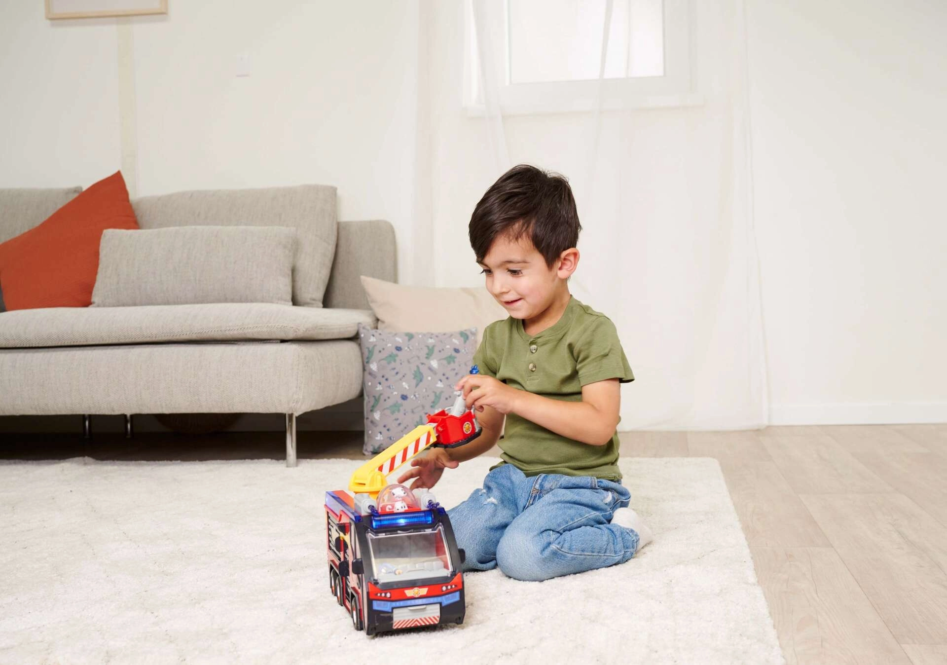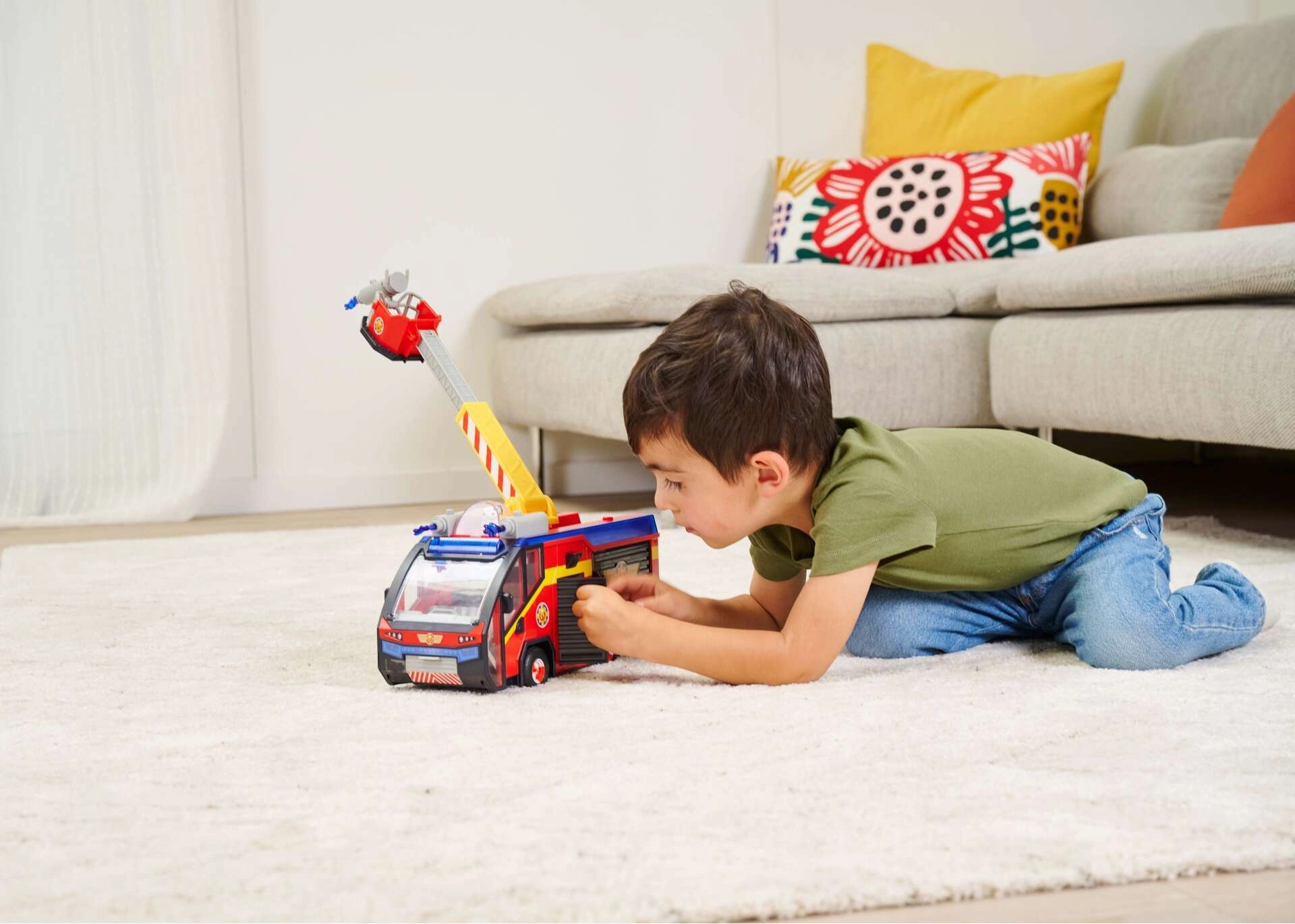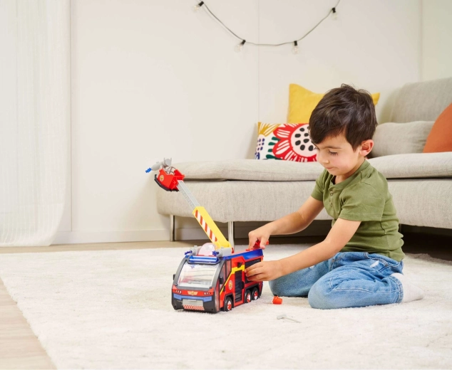 - Svetlobni in zvočni učinki: Gasilski avto oddaja realistične zvoke in ima spektakularno 360° osvetlitev, ki zagotavlja realistično kuliso za igro. Izvlečni odlagalni prostori za orodje. Na strehi je odprtina z kabino za psa.