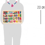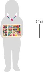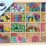 Kreativni komplet za male oblikovalce nakita: v leseni škatli s prozornim drsnim pokrovom najdete skupaj 157 lesenih kroglic, 6 vrvic za nizanje in 3 obeske. Zahvaljujoč 19 predalčkom je vse pregledno razporejeno, kar spodbuja fino motoriko, potrpežljivost in kreativnost otrok – idealno tudi na poti.