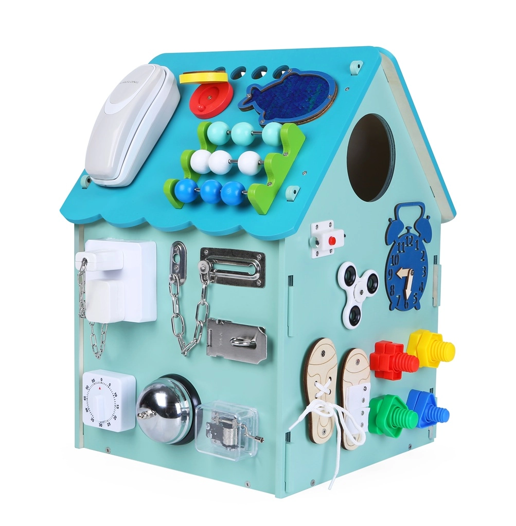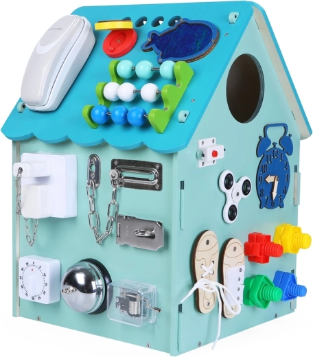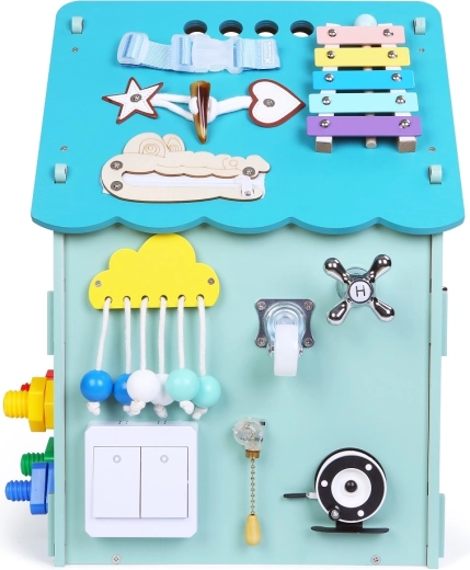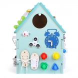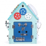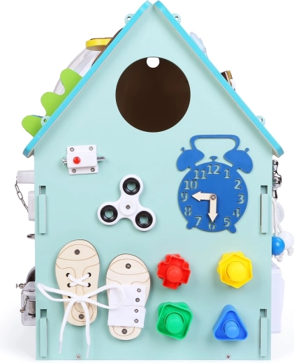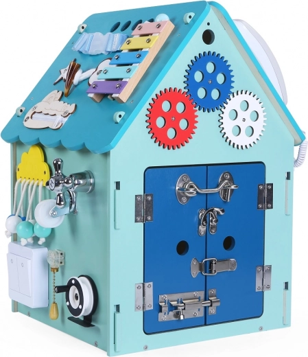 Ta trdna lesena hiška je polna funkcionalnih elementov, ki otroke spodbujajo k raziskovanju. Od zvonca do telefona ter različnih ključavnic in zaponk – vsaka podrobnost podpira samostojnost in praktične veščine skozi igro. Barvna obdelava se lahko rahlo razlikuje v turkizne odtenke.