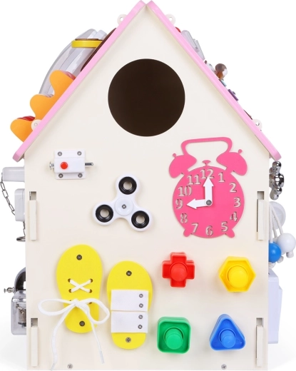 Interaktivna lesena hiška z množico elementov za senzorično raziskovanje in učenje razvija fino motoriko, koordinacijo roka–oko in samostojnost. Otroci si na zabaven način vadijo zapinjanje, zavezovanje, preklapljanje, vrtenje in odklepanje, hkrati pa se spoznajo z abakom in uro.