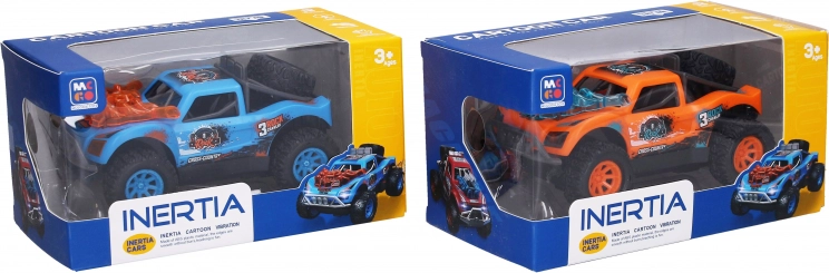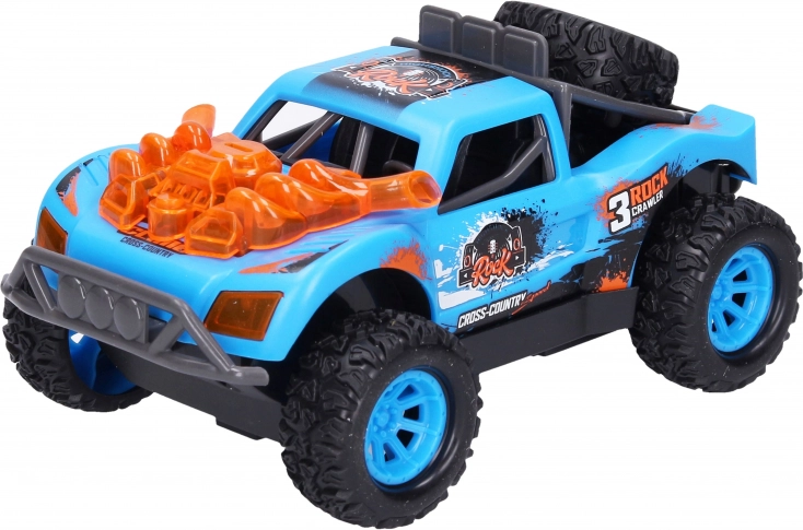 Terensko vozilo na vztrajnik 15 cm s svetlobo in zvokom. Pozibavanje motorja, učinki ob pritisku na rezervno kolo, 3× AG13 baterije v paketu. Modra ali oranžna.