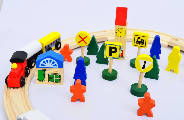 - Lesni tiri, vlak z vagoni na magnet, figurice, avto, stavba, prometni znaki