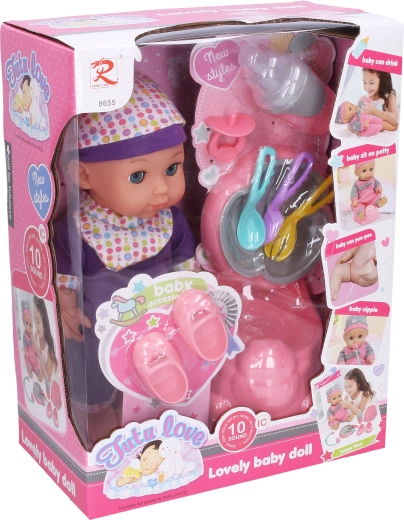 V kompletu je vse, kar potrebujete za popolno izkušnjo: kahlica, krožniček, pribor, steklenička in dudo. Punčka ima idealno velikost 30 cm, lepo sede v roko in je primerna za vsakodnevno igranje doma ali na poti.