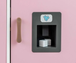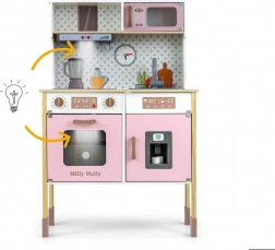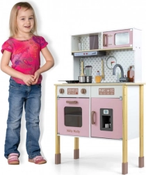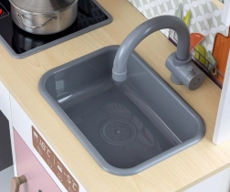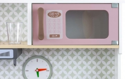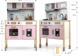 V kompletu so pečica s prozornim okencem, mikrovalovna pečica, hladilnik z realističnim izdelovalnikom ledu in enodelno korito. Na panelu je kuhinjska napa z lučko in zvokom, drsni kavlji za obešanje dodatkov in ura s premičnimi kazalci za učenje časa. Ilustracije kuhinjskih elementov na steni spodbujajo domišljijo in tematsko igro.
