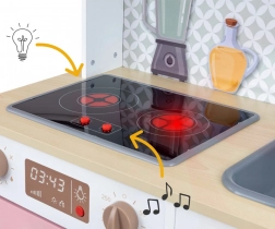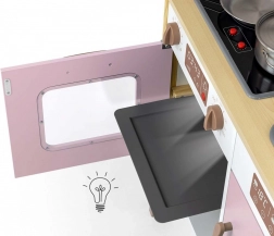 Kuhalna plošča z zvokom kuhanja in osvetlitvijo, pečica z lučko ter klikalni regulatorji otrokom pričarajo pristno kuharsko izkušnjo.