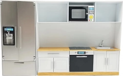 Set vsebuje vse, kar potrebujete za ustvarjanje popolnoma opremljene kuhinje. Majhni gospodinjski aparati – pečica, mikrovalovna pečica, hladilnik, zamrzovalnik in celo izdelovalnik ledenih kock!