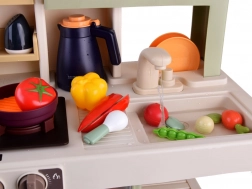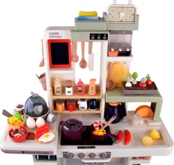 Ta prostorna plastična kuhinjica v sodobnih barvah bo navdušila vsakega otroka, ki rad kuha v igri. Realistični elementi, kot so osvetljene kuhalne plošče, zvoki kuhanja in varna para iz gorilnikov, ustvarjajo pristno izkušnjo. Zahvaljujoč funkcionalni pipi z zaprtym vodnim krogom lahko otroci preizkusijo pomivanje posode in zalivanje “zelišč”.